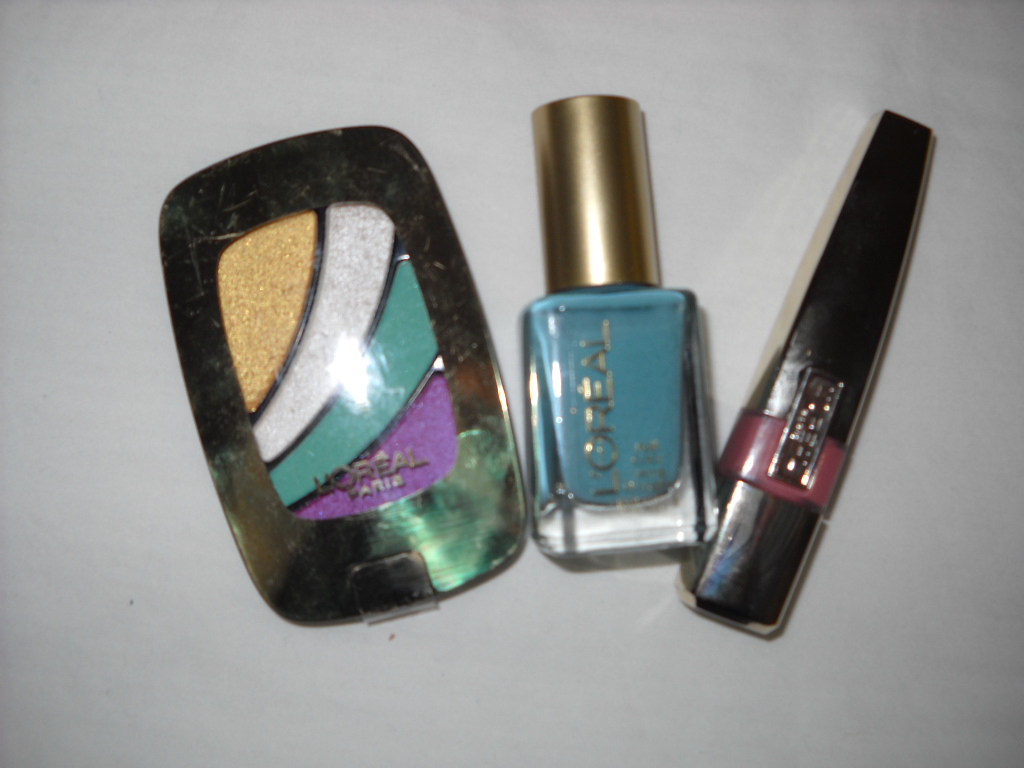 Loreal eyeshadow includes 4 colors: Gold , white , green and purple. They are very shinny and can last all day.